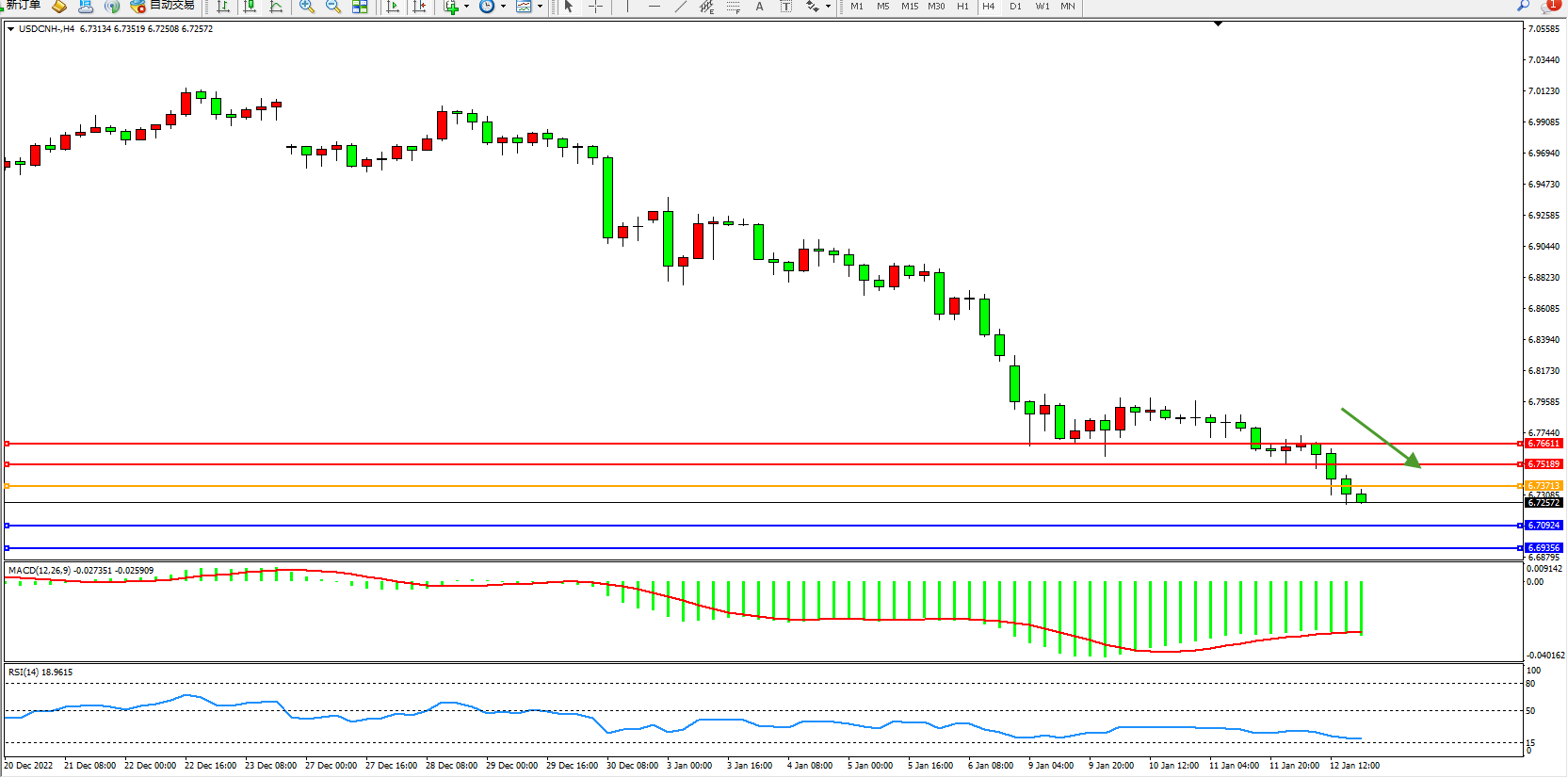 美元人民币USDCNH——4小时K线图显示: