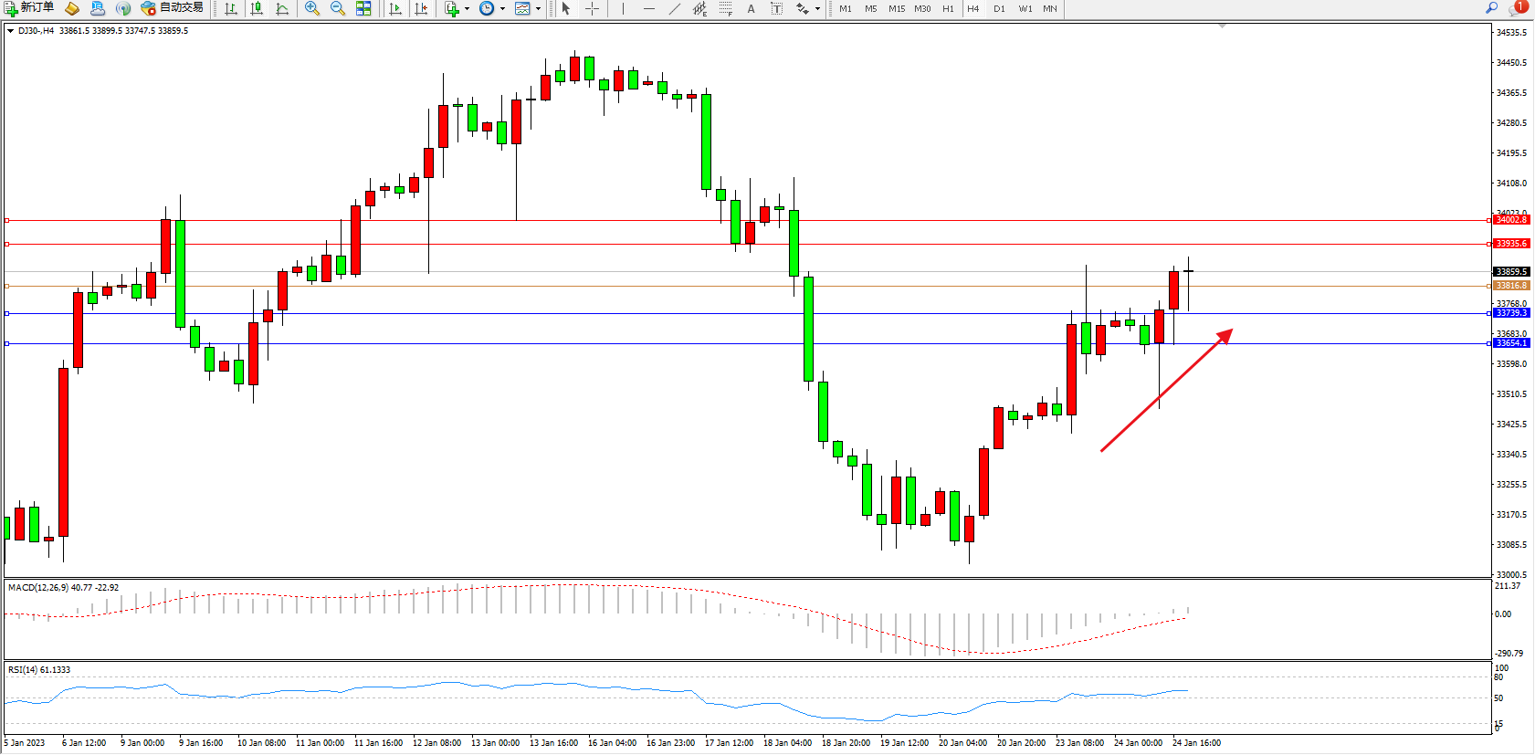 道琼斯指数DJ30——4小时K线图显示: