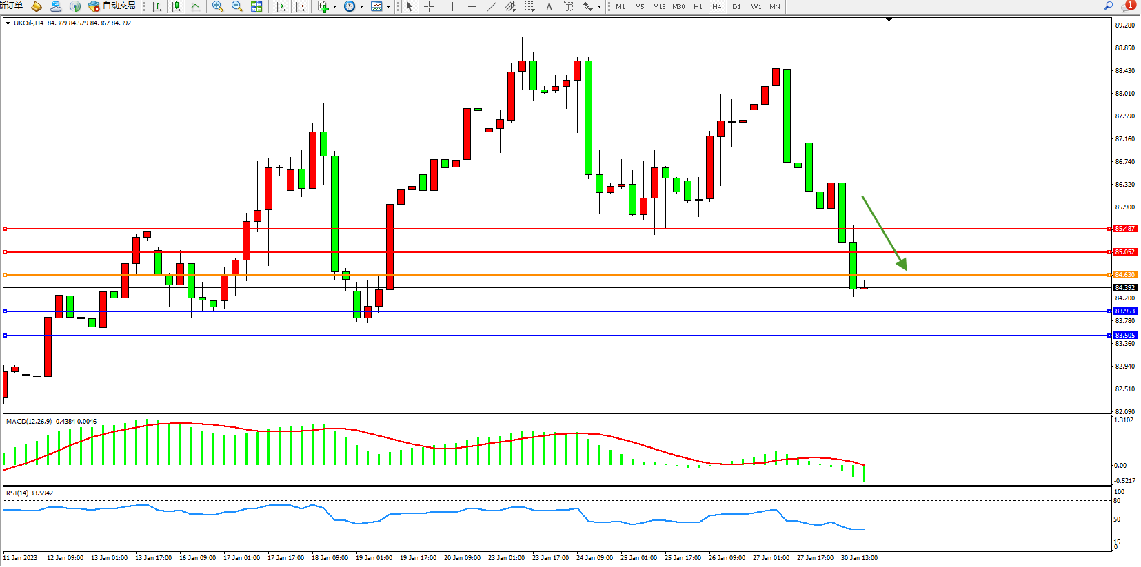 交易策略:84.630下方看跌,目标83.953、83.505