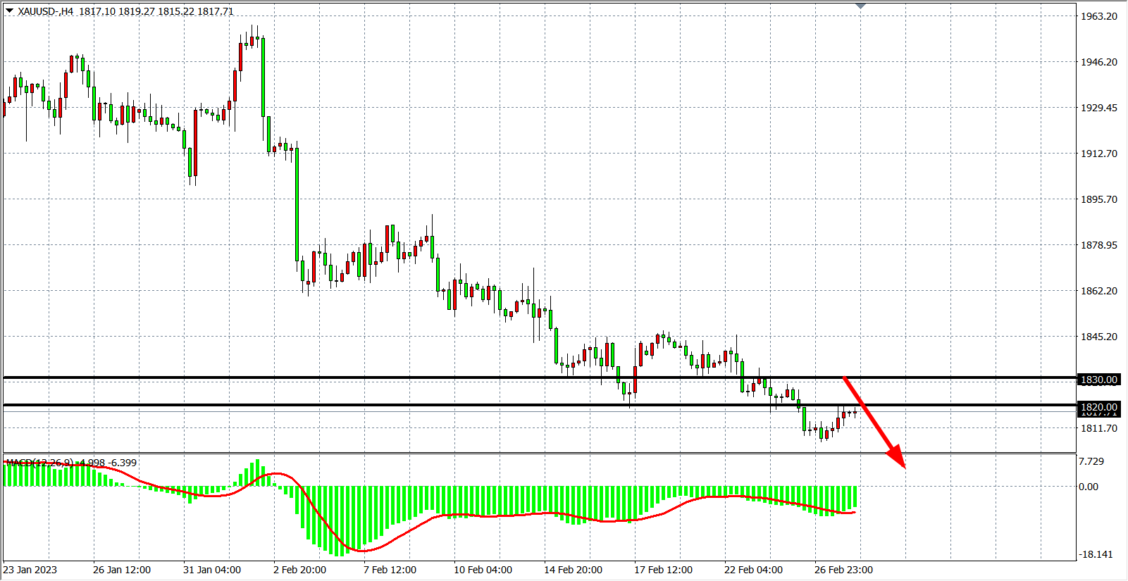 4小时图看,金价跌破1820后继续扩大跌幅,MACD在零轴之下呈继续放量状态,行情或进一步走空,当前1820-1830为强阻力区域,日内在1830之下继续看空为主,下看1800-1780附近。