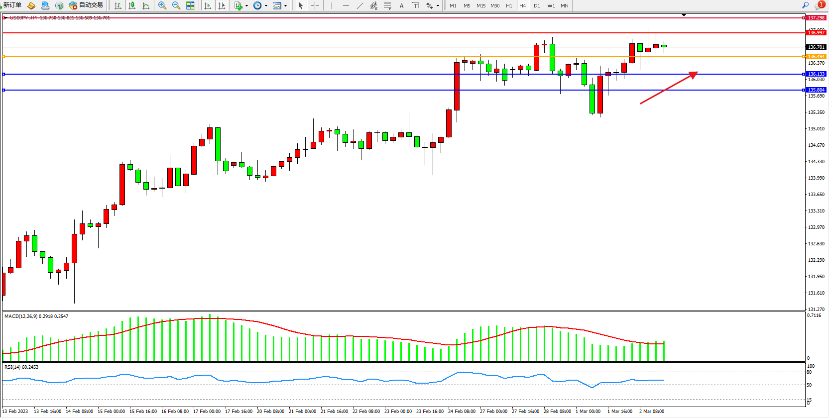 交易策略:136.494上方看涨,目标136.997、137.298