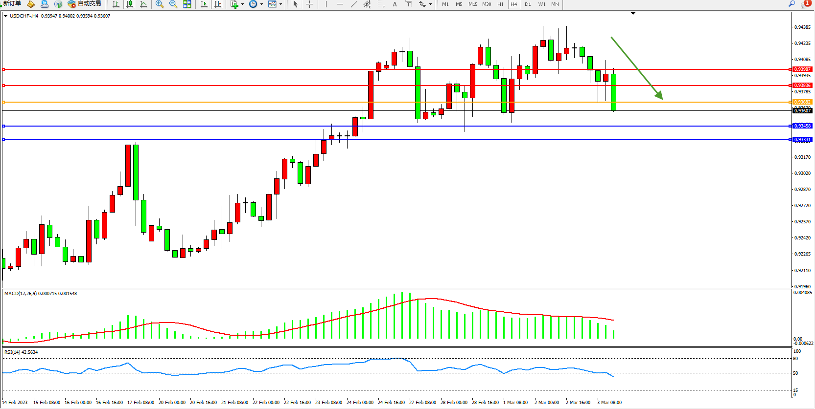交易策略:0.93582下方看跌,目标0.93458 0.93331