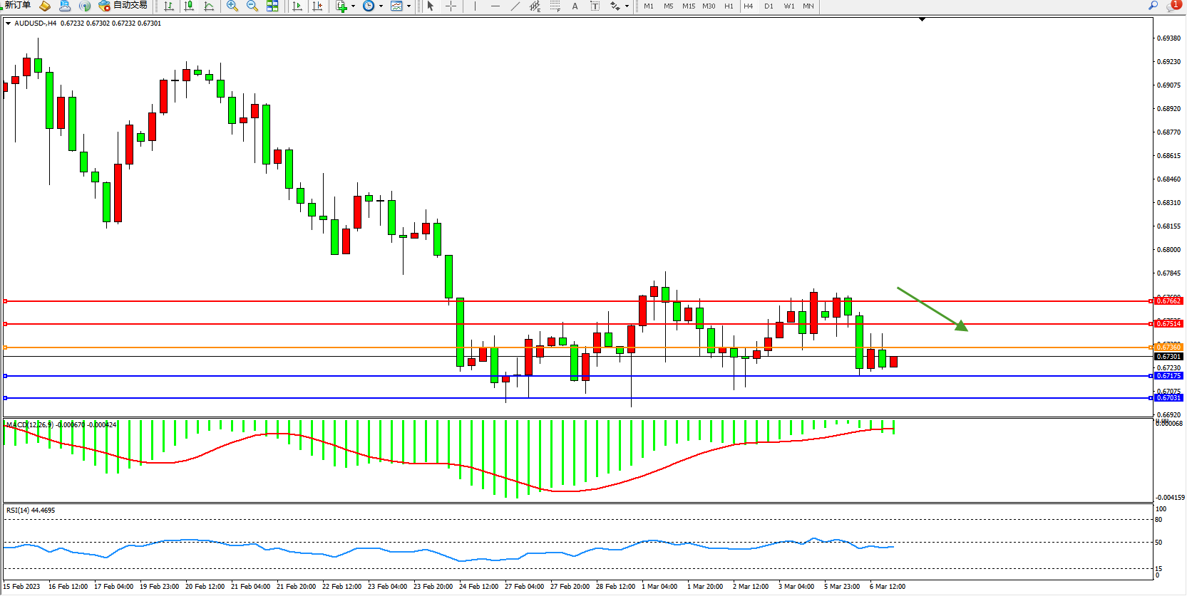 交易策略:0.67360下方看跌,目标0.67175 0.67031