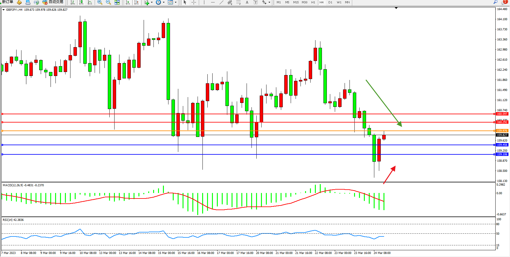 交易策略:159.976下方看跌,目标159.456 159.106