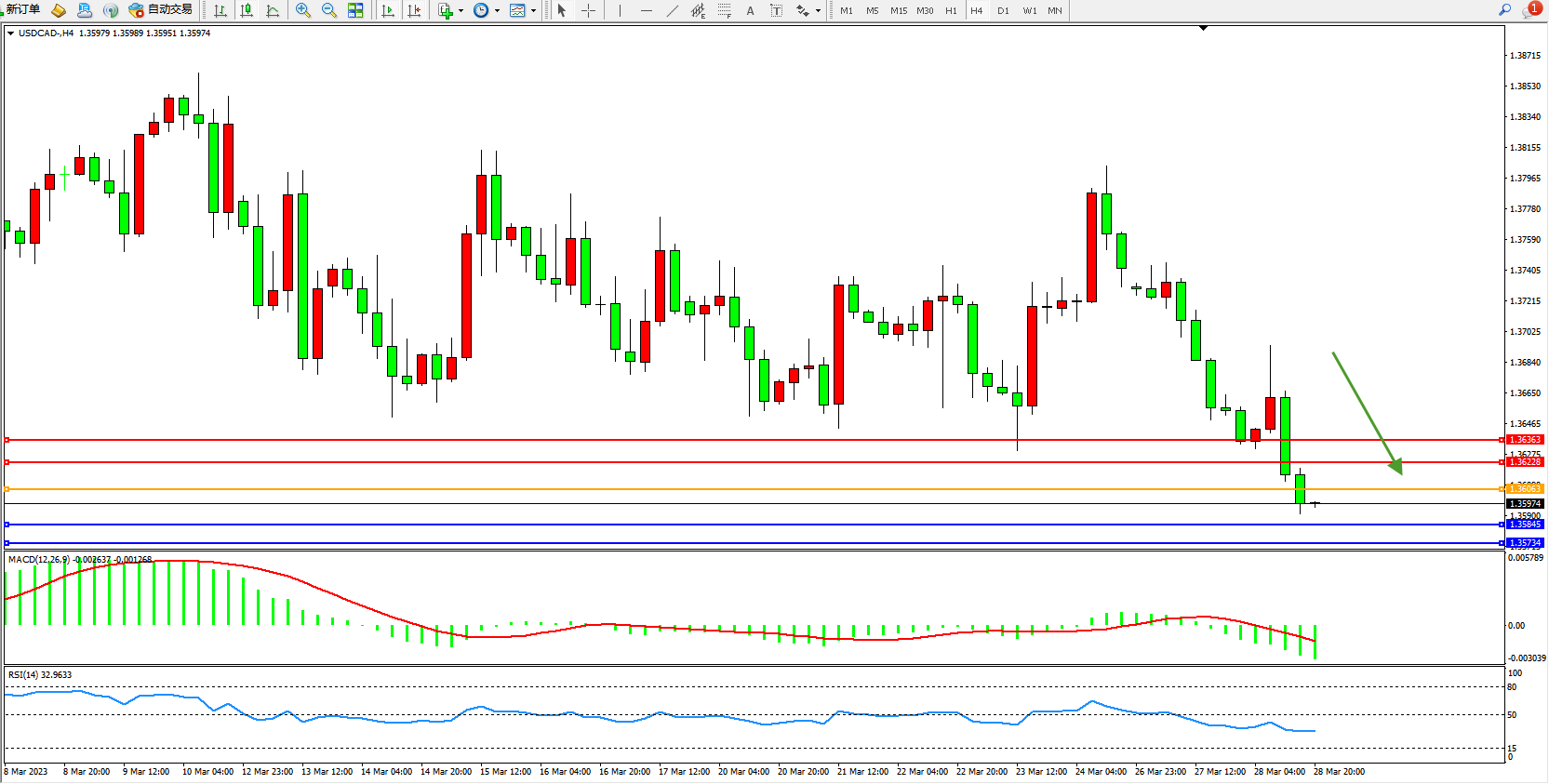 美元加元USDCAD——4小时K线图显示: