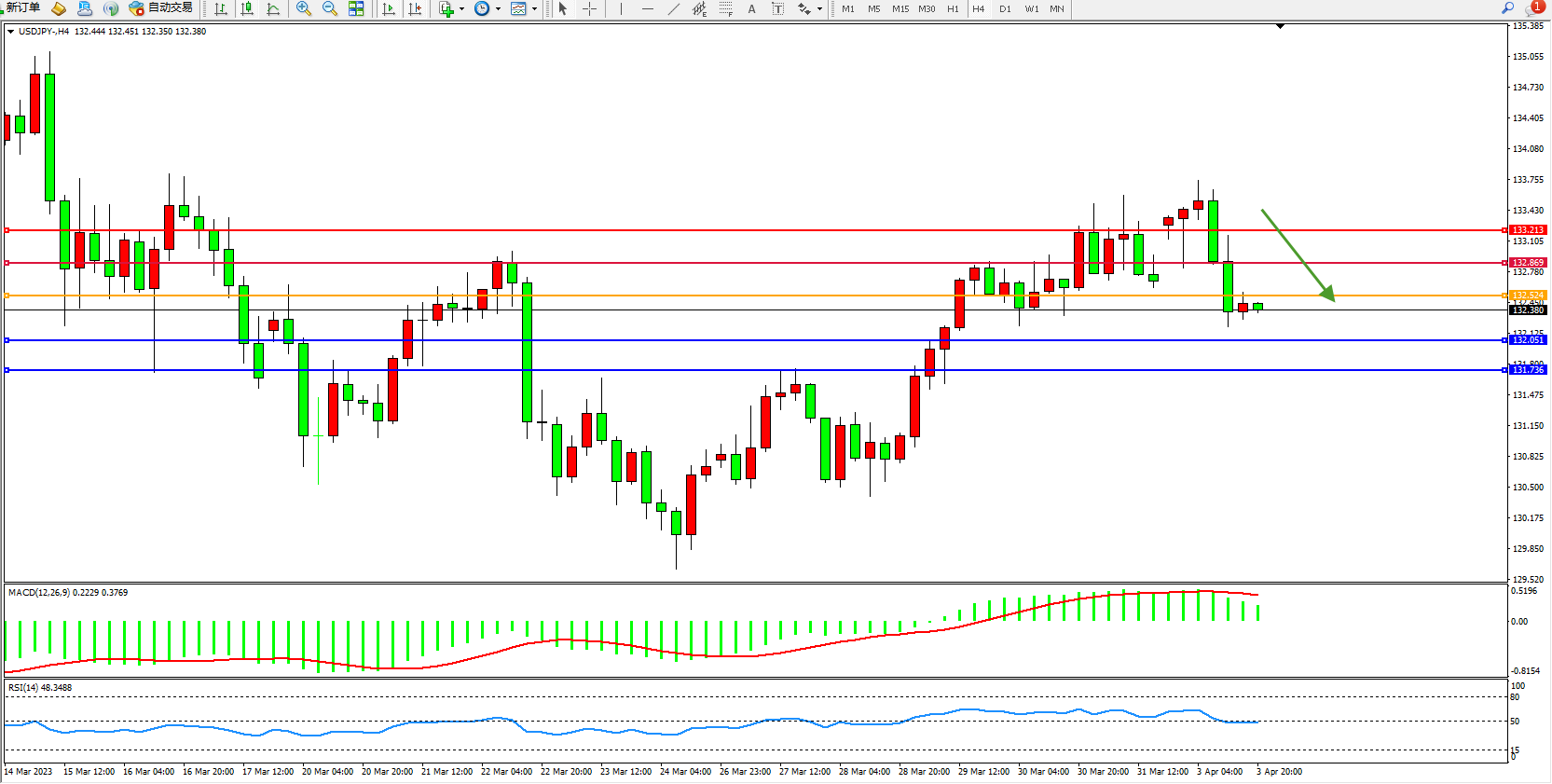 交易策略:132.524下方看跌,目标132.051 131.736