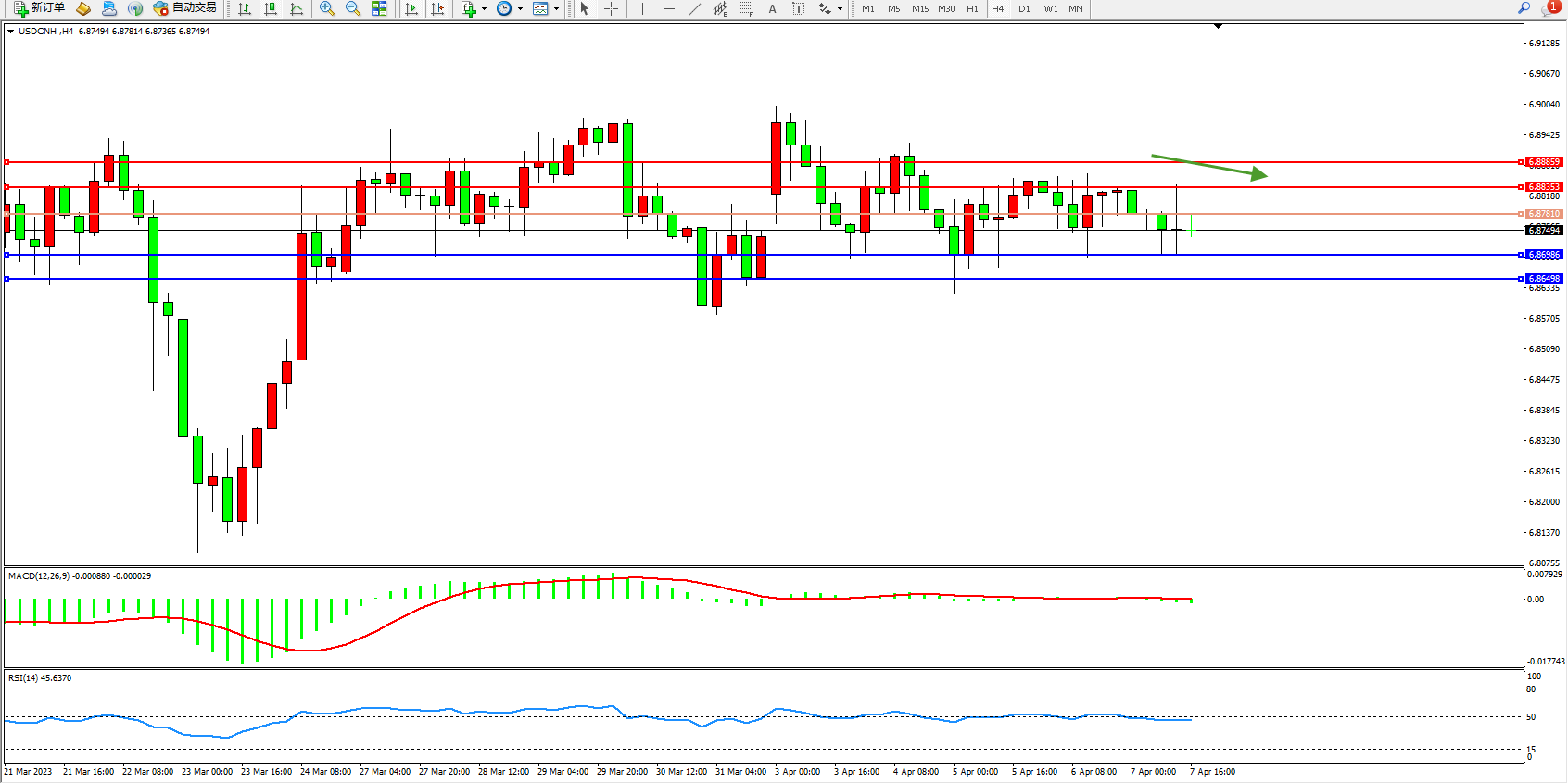 交易策略:6.87810下方看跌,目标6.86986 6.86498