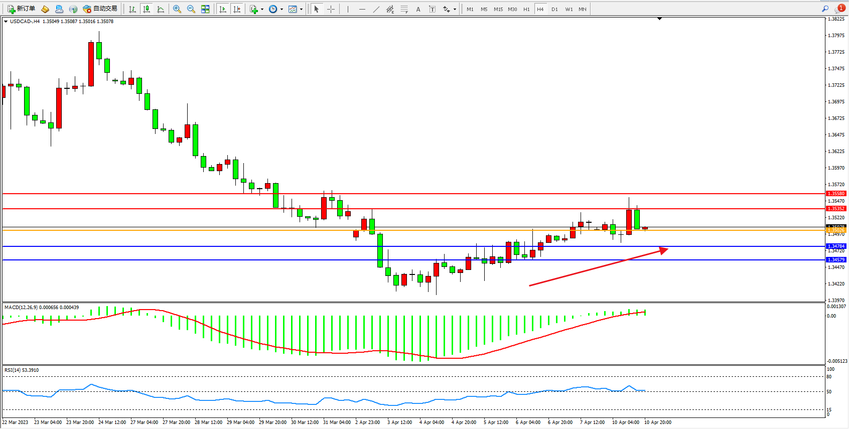 美元加元USDCAD——4小时K线图显示: