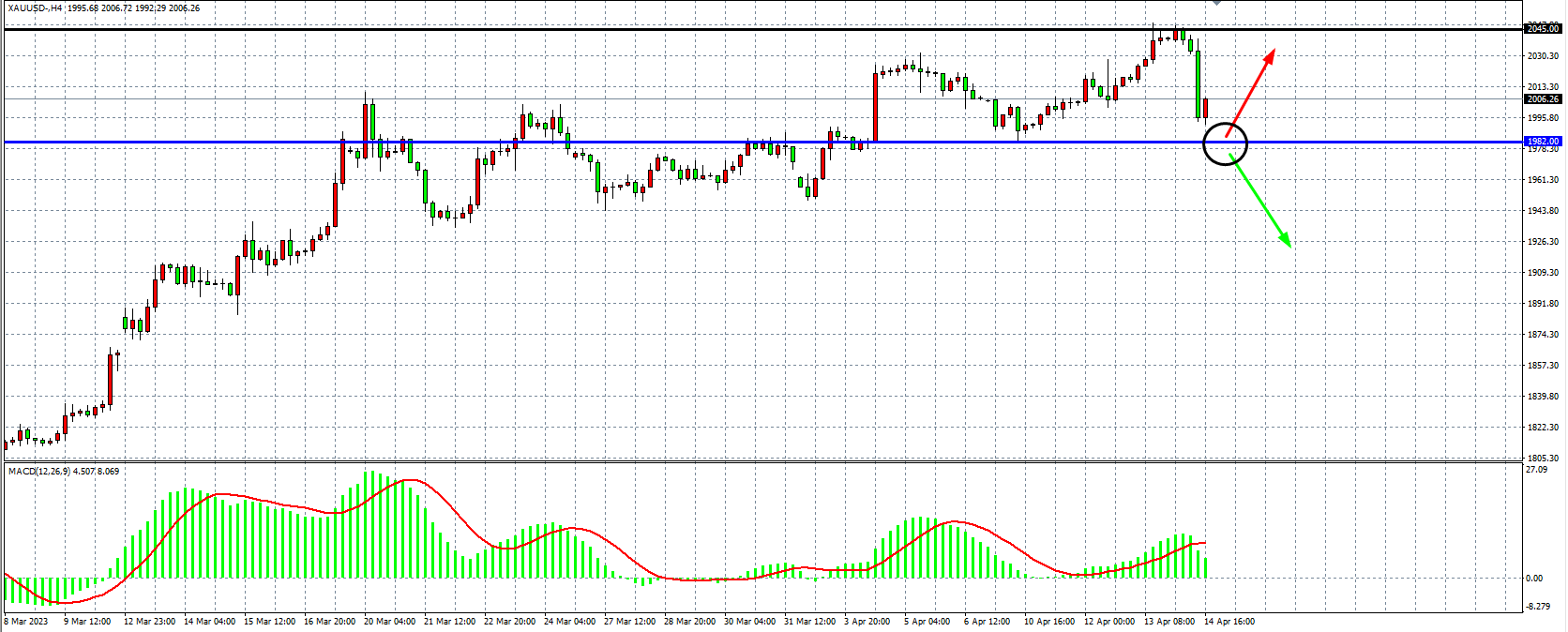 4小时图看,黄金在2050关口出现冲高回落,同时MACD量能在零轴之上有所缩量,回调需求加剧,当前支撑关注1982附近,同时上方压力于2045附近,1982上方仍可看涨,跌破1982则下看1960-1940附近。