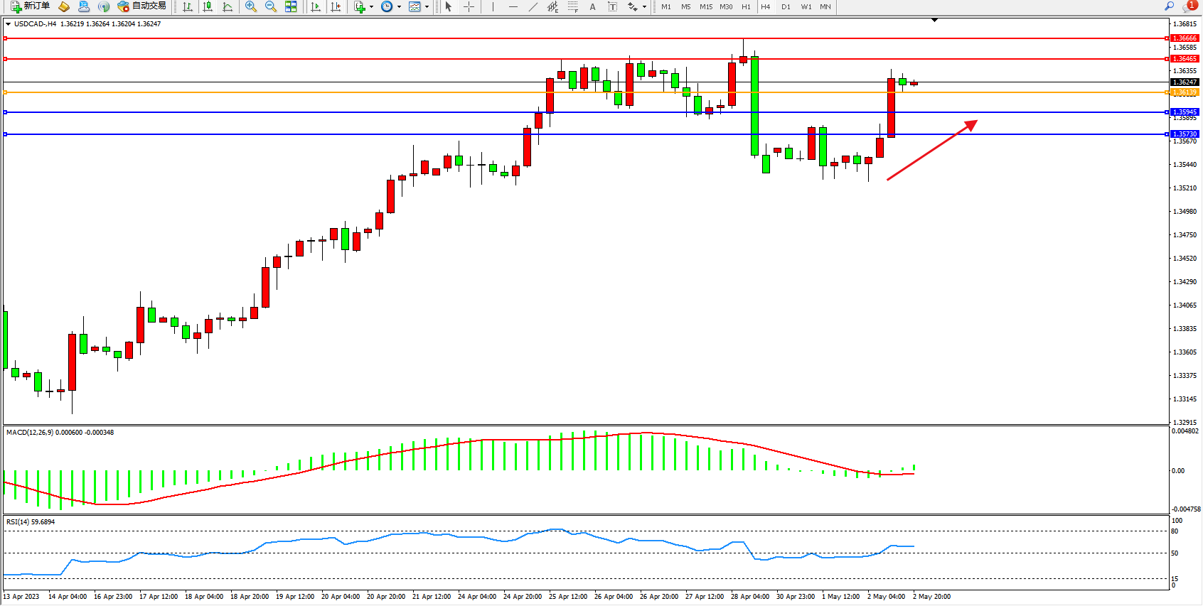 美元加元USDCAD——4小时K线图显示: