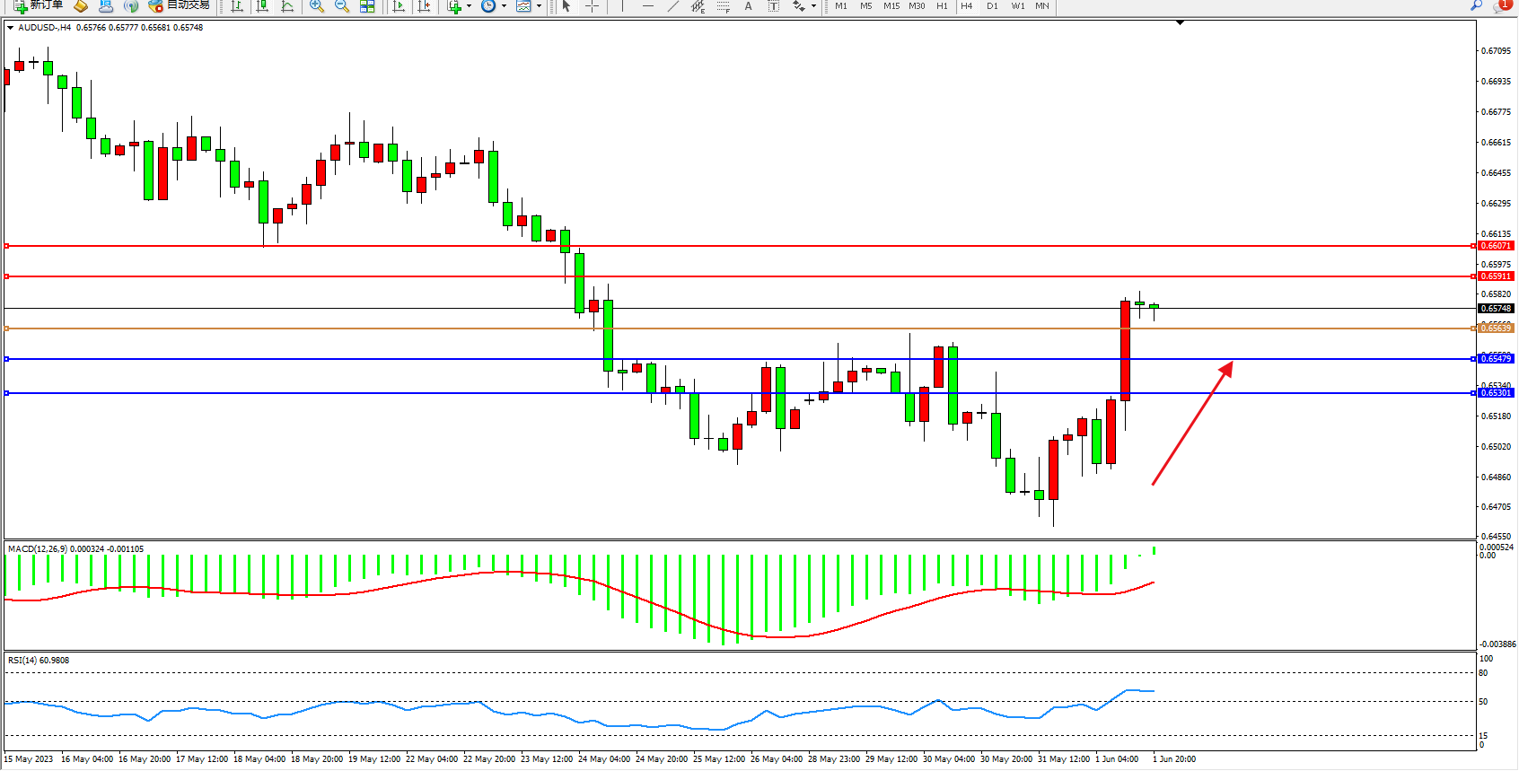 澳元美元AUDUSD——4小时K线图显示: