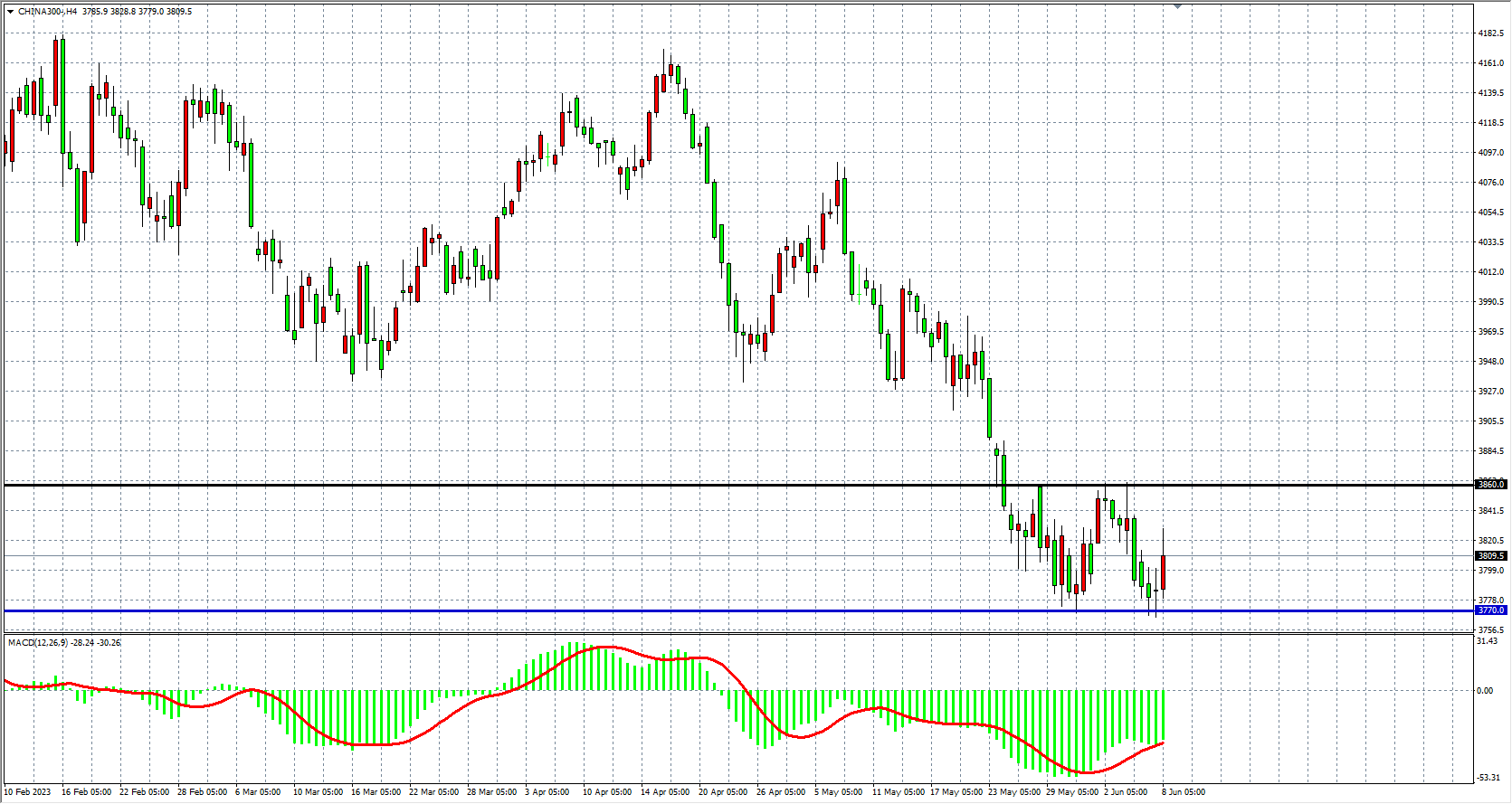 4小时图看,沪深300在3800附近维持盘整,下方3770支撑依旧有效,MACD量能在零轴下维持放量,行情进入宽幅整理,上方阻力3860,下方支撑3770。
