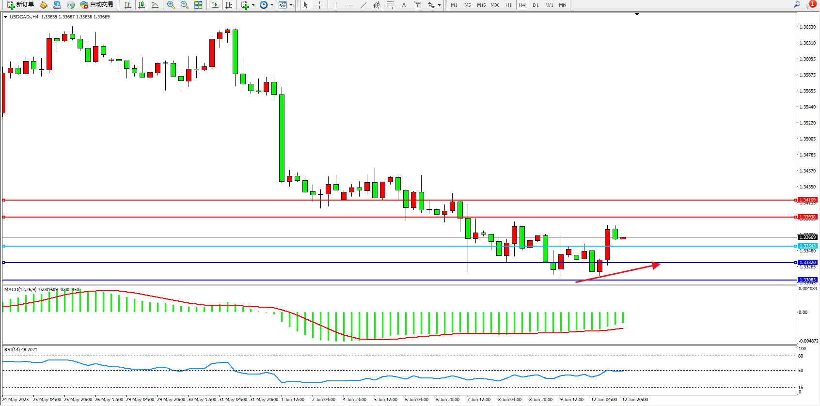 美元加元USDCAD——4小时K线图显示: