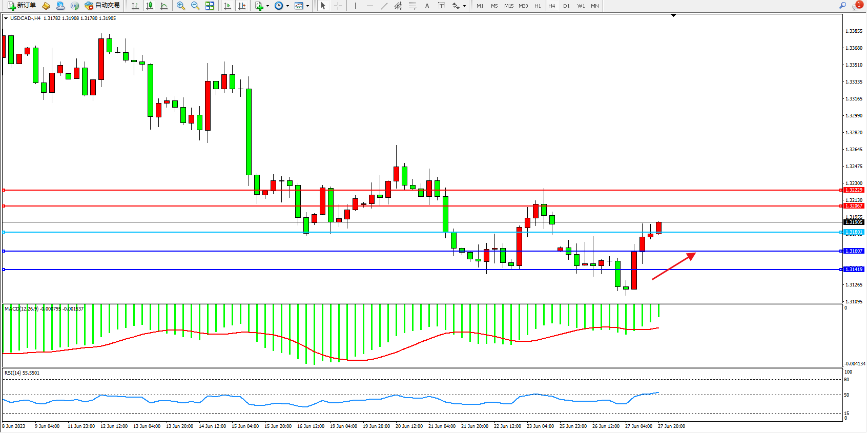 美元加元USDCAD——4小时K线图显示:
