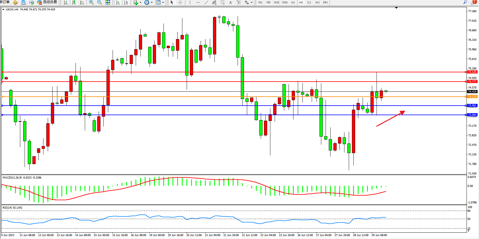 交易策略:74.229上方看涨,目标74.777  75.126