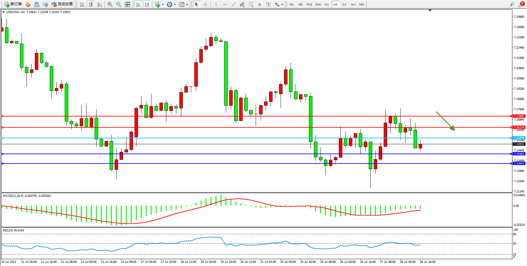 交易策略:7.15399下方看跌,目标7.14163  7.13411