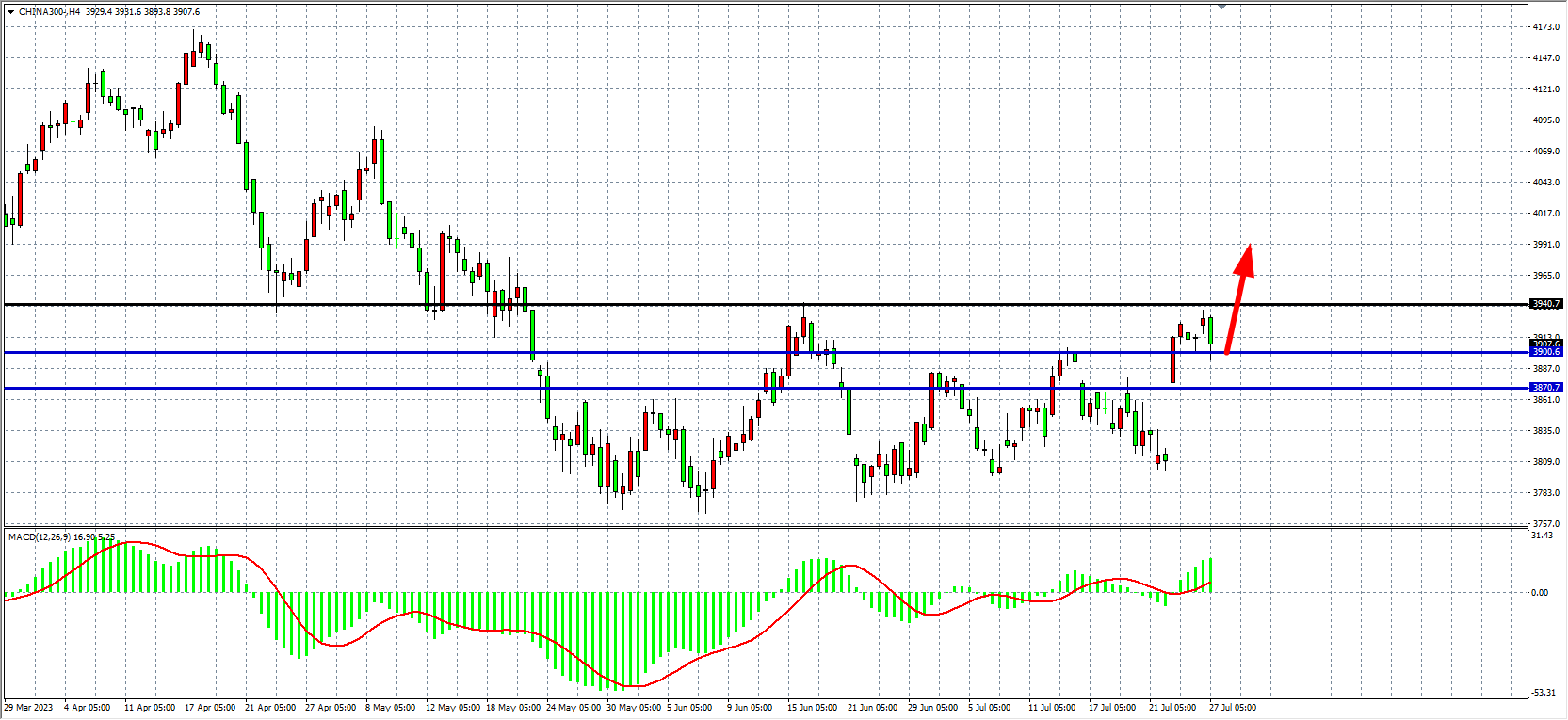 4小时图看,沪深300维持在3900之上,MACD在零轴上放量,行情形成破位上攻,支撑关注3870-3900附近,上方压力看3940-3980。