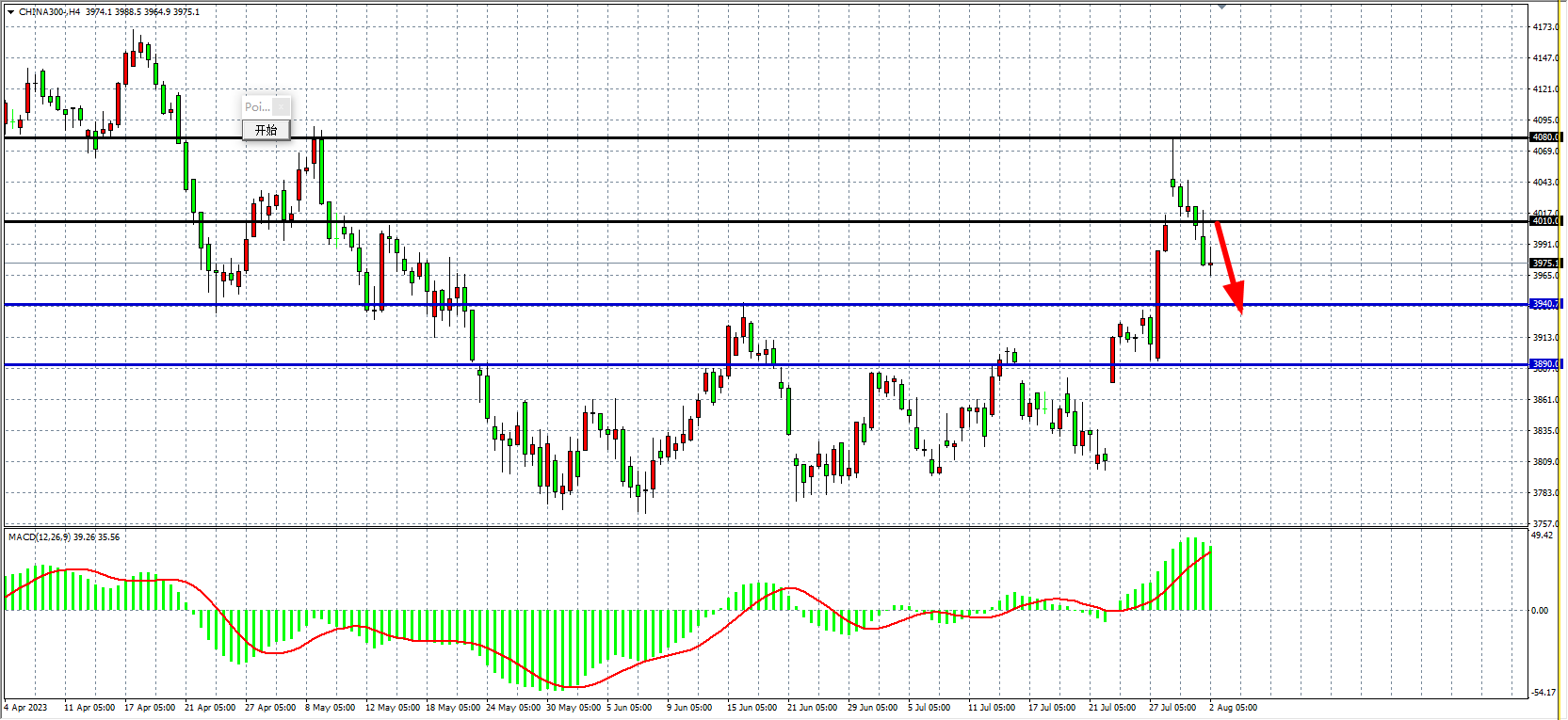 4小时图看,沪深300冲高回落后延续调整,MACD量能维持零轴上,趋势进入调整,支撑重点关注3990,上方压力4010-4080附近。