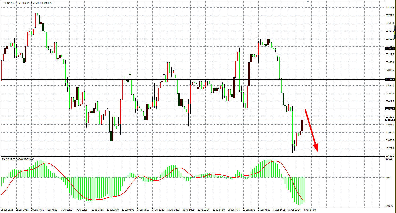 4小时图看,道指在35300附近盘整,MACD量能下穿零轴,行情高位回落见顶,阻力关注35300-35600附近。