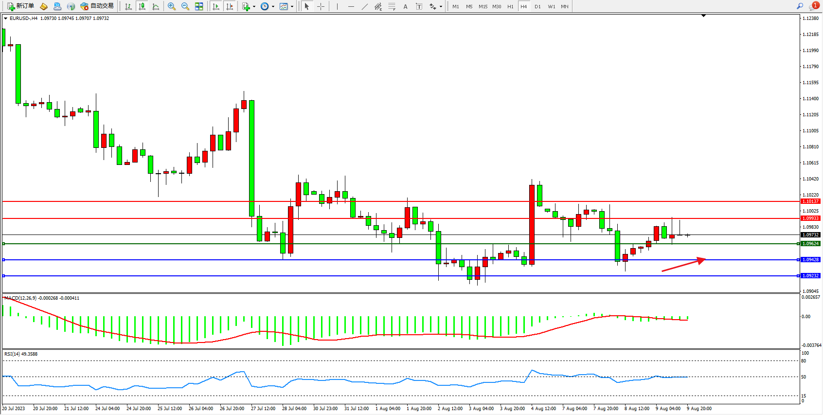 欧元美元EURUSD—4小时K线图显示: