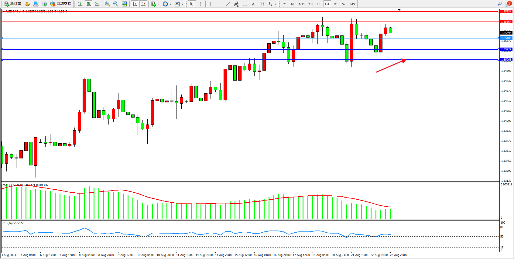 美元加元USDCAD——4小时K线图显示: