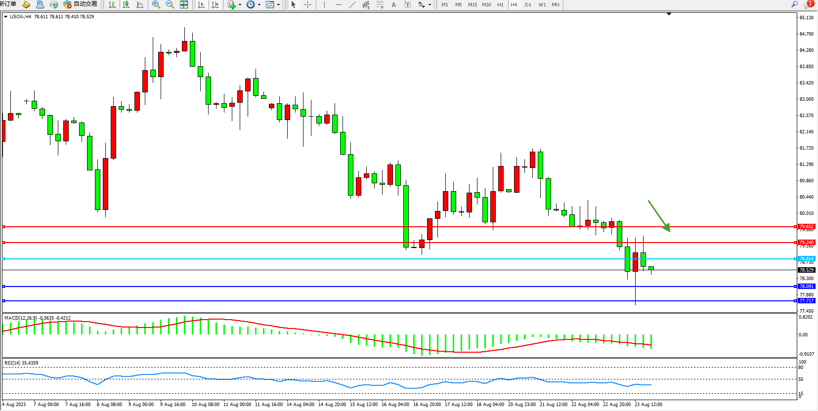交易策略:78.814下方看跌,目标78.091  77.717