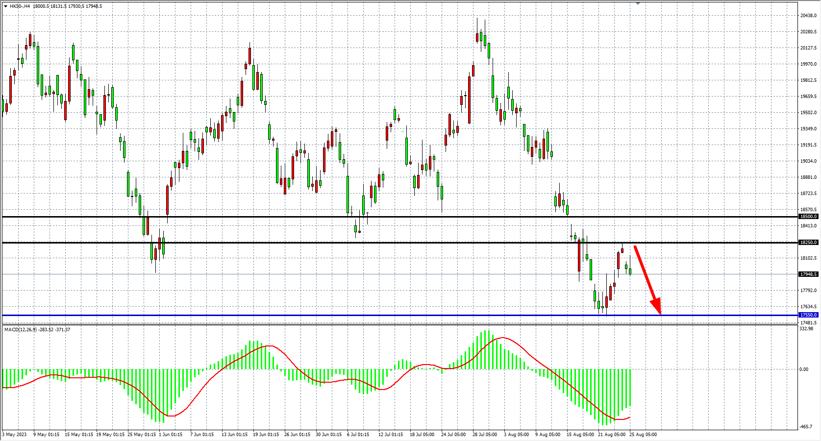 周五(8月25日)港股三大指数全天维持下跌行情,恒指下跌1.4%