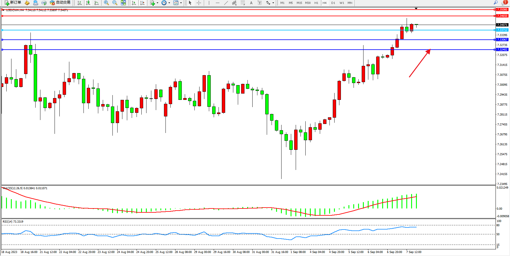 交易策略:7.33712上方看涨,目标7.34650  7.35080