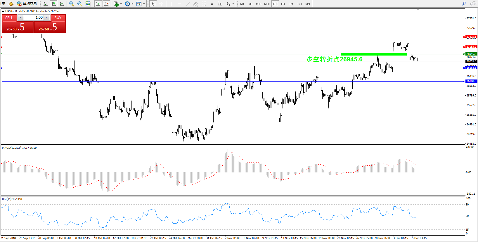 恒指HK50 ——1小时K线图显示: