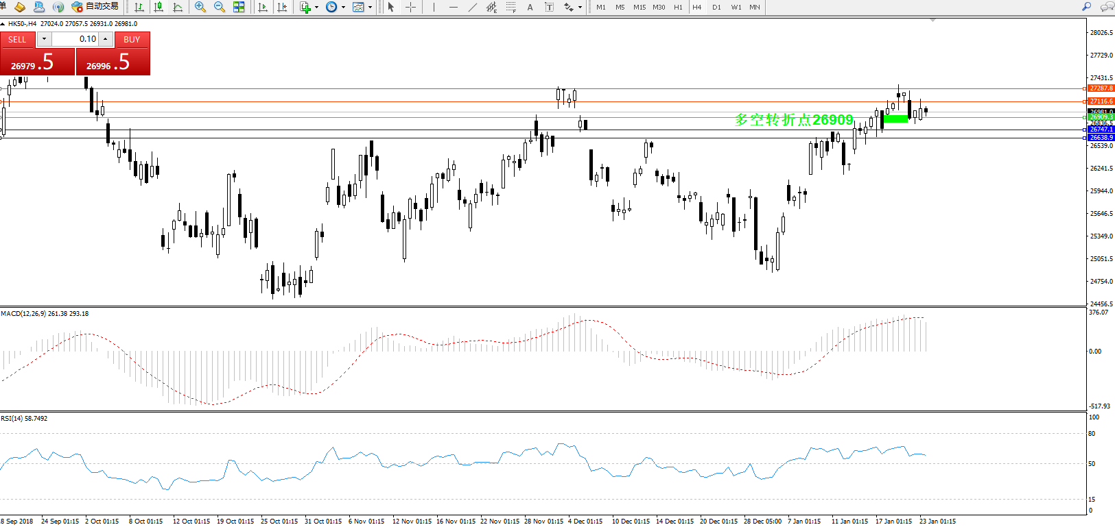 恒指HK50 ——4小时K线图显示: