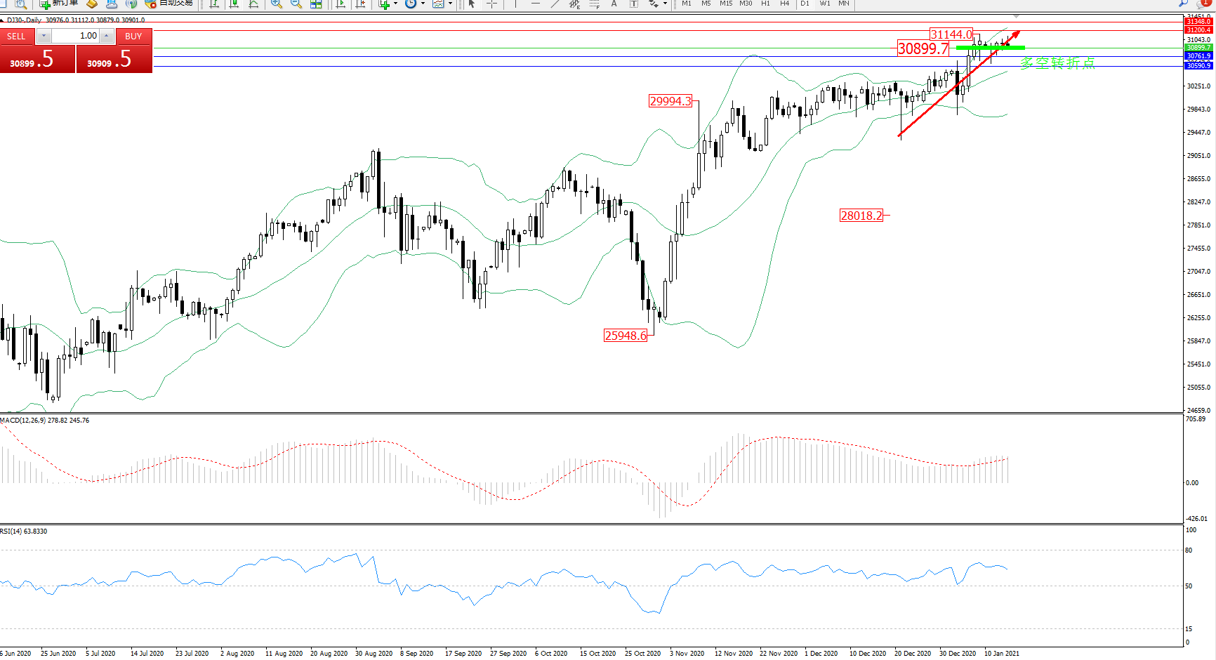 道琼斯指数DJ30—— 日K线图显示: