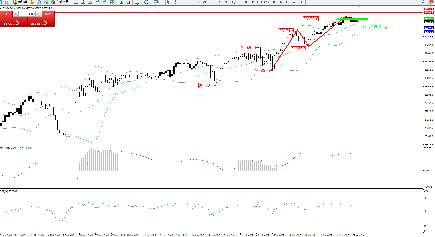 交易策略:33929下方看跌,目标33307、33036
