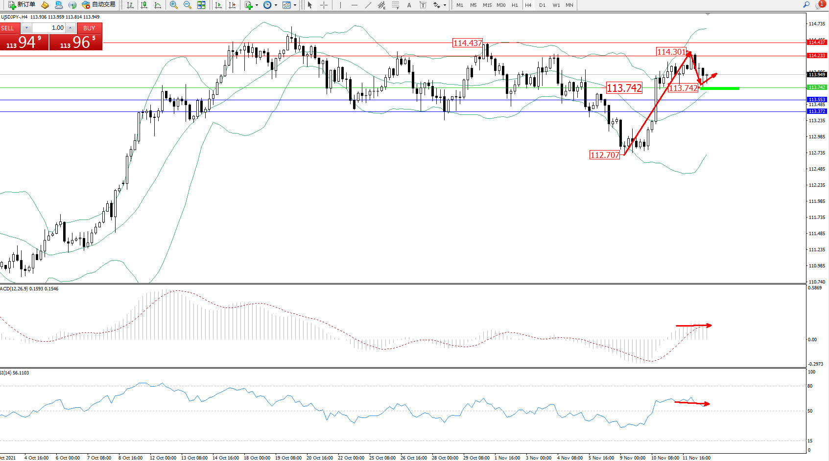 交易策略:113.742上方看涨,目标114.233、114.437