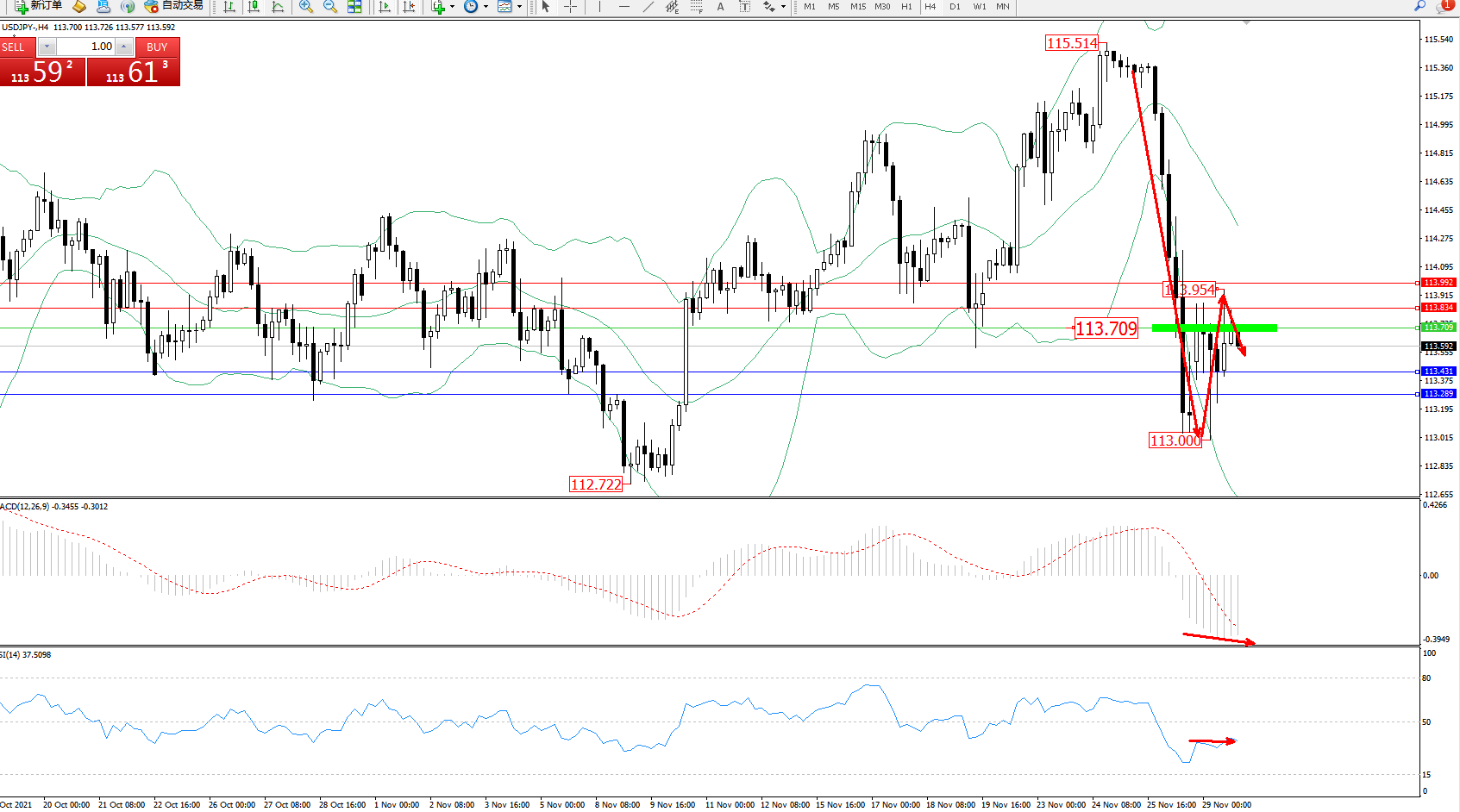 交易策略:113.709下方看跌,目标113.431、113.289