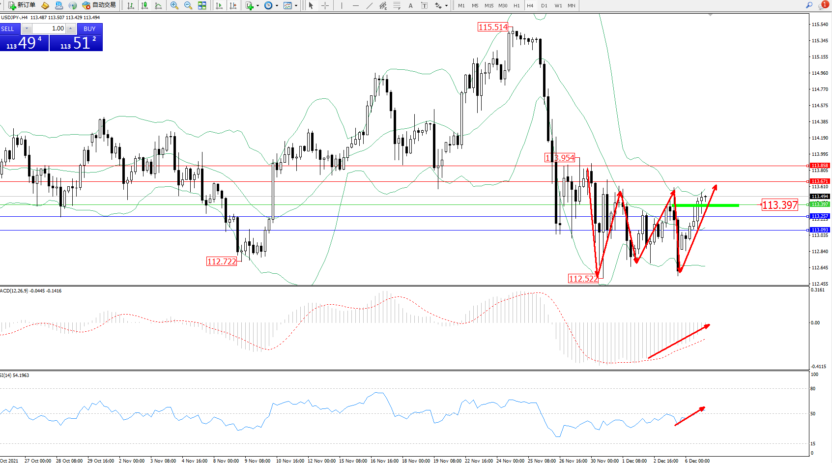 交易策略:113.397上方看涨,目标113.671、113.858