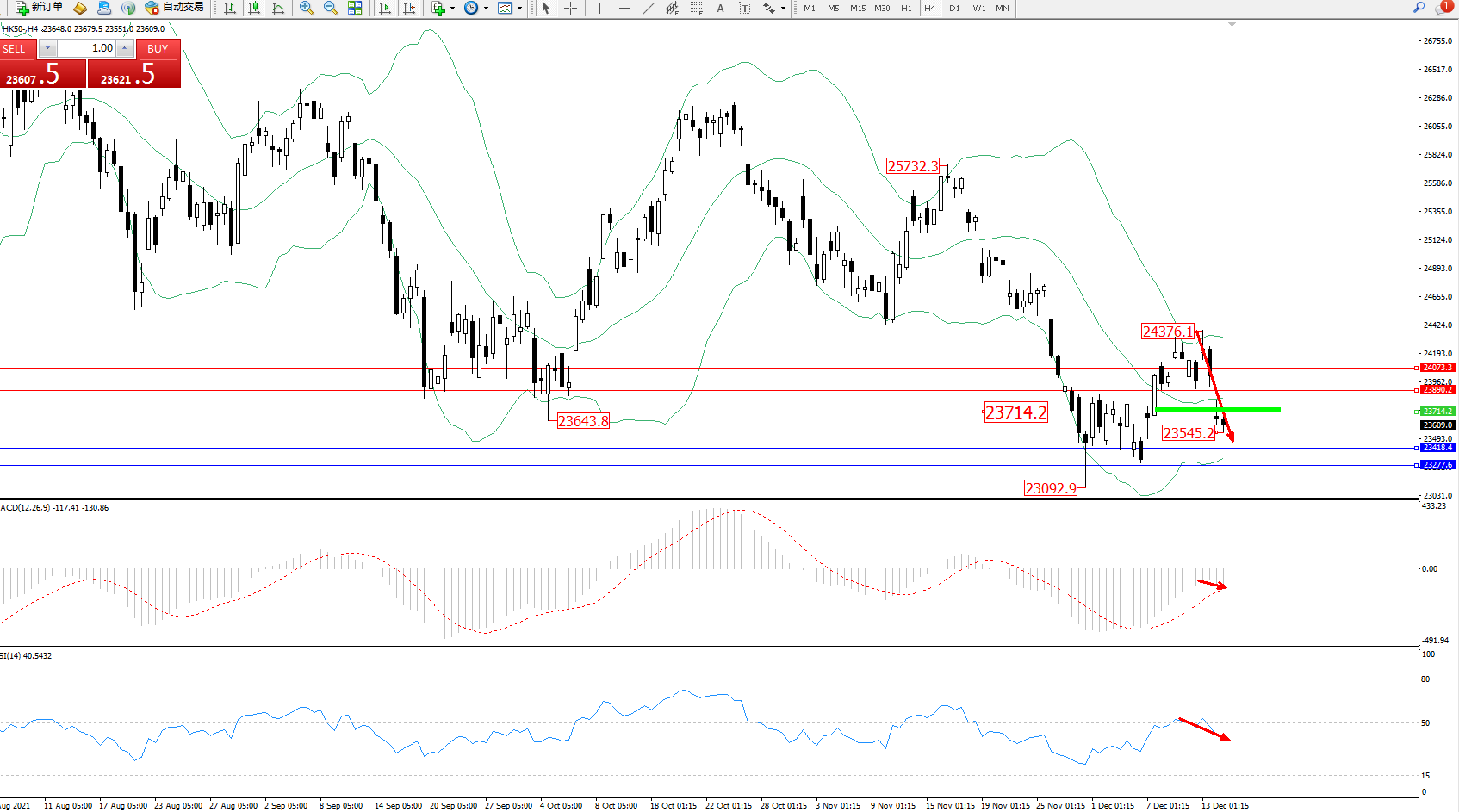 恒指HK50 ——4小时K线图显示: