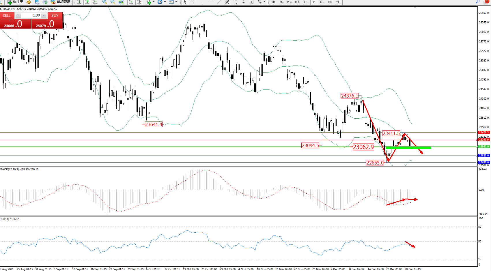 恒指HK50 ——4小时K线图显示: