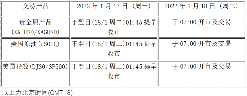 因应美国马丁路德金纪念日假期(2022年1月17日周一), 本公司以下产品的交易时间将于假期期间作以下安排,敬请留意。