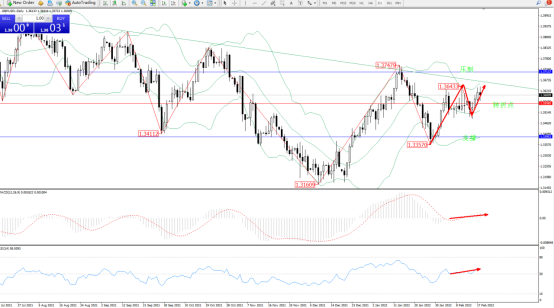 长时间维持在布尔带指标通道内中上轨区间窄幅整理缓慢上移,即将触及高位下行趋势线,期间多次触及中上轨区间节点,布尔带指标呈收口走势后有缓慢张口上移迹象,上方压制关注1.37137附近,低位支撑关注1.33953附近,关注1.35585附近转折点,MACD指标处于0轴线上侧弱势徘徊上移,RSI指标处于50均衡线上侧窄幅整理向上移动中,如图: