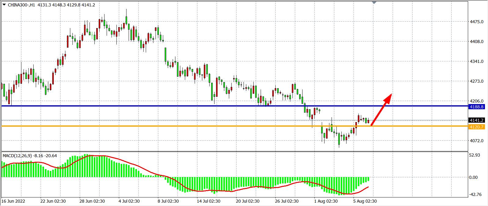1小时图看,沪深300在4050获得支撑后反攻向上,顺利回补了前期跳空缺口,同时MACD于零轴之下量能缩短,目前支撑已上移至4120,日内在该位之上继续看反弹,在4120之上看4200-4270