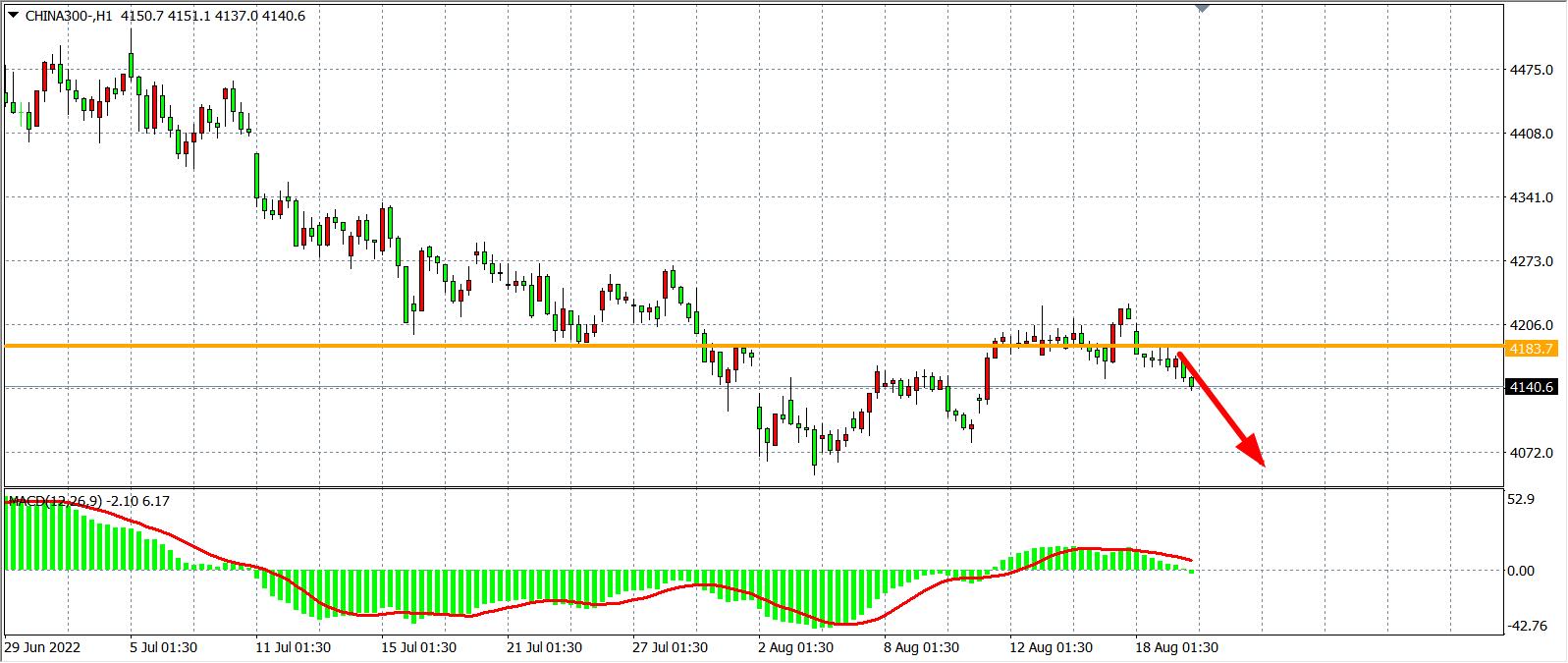 1小时图看,沪深300反弹至4183后再度受阻延续跌势,目前该位成为当前短线阻力,MACD于零轴之上量能开始收缩,预示行情或进入调整,日内在4183之下继续看跌,下方目标4100-4050